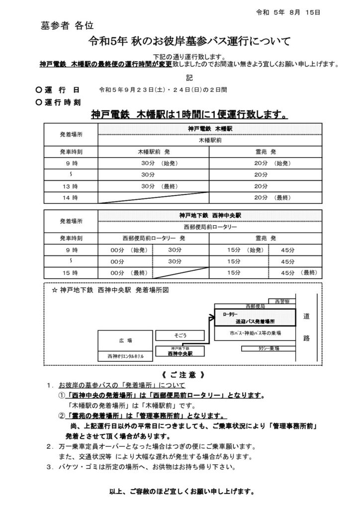 神戸平和霊苑、秋のお彼岸のバス運行のお知らせ